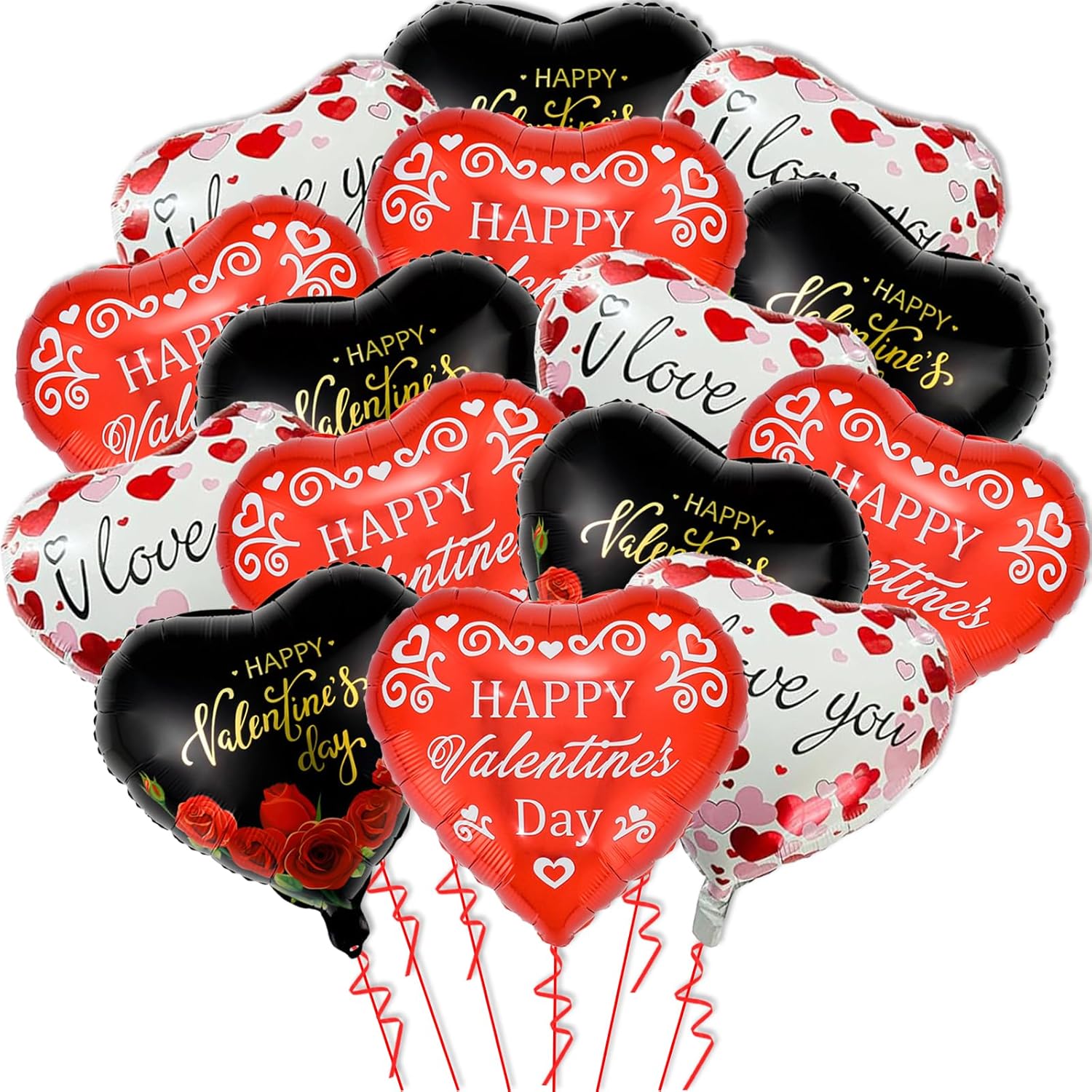 - 【Valentines Day Decorations】Want to create a special surprise for your loved one? Shower all your love with this 18inch heart balloons set. It comes with black heart balloon with rose 5pcs, i love you white heart balloon 5pcs, happy valentines day red heart balloon 5pcs. Use these happy valentine balloons for black and red valentines day decorations for the home or valentine decor