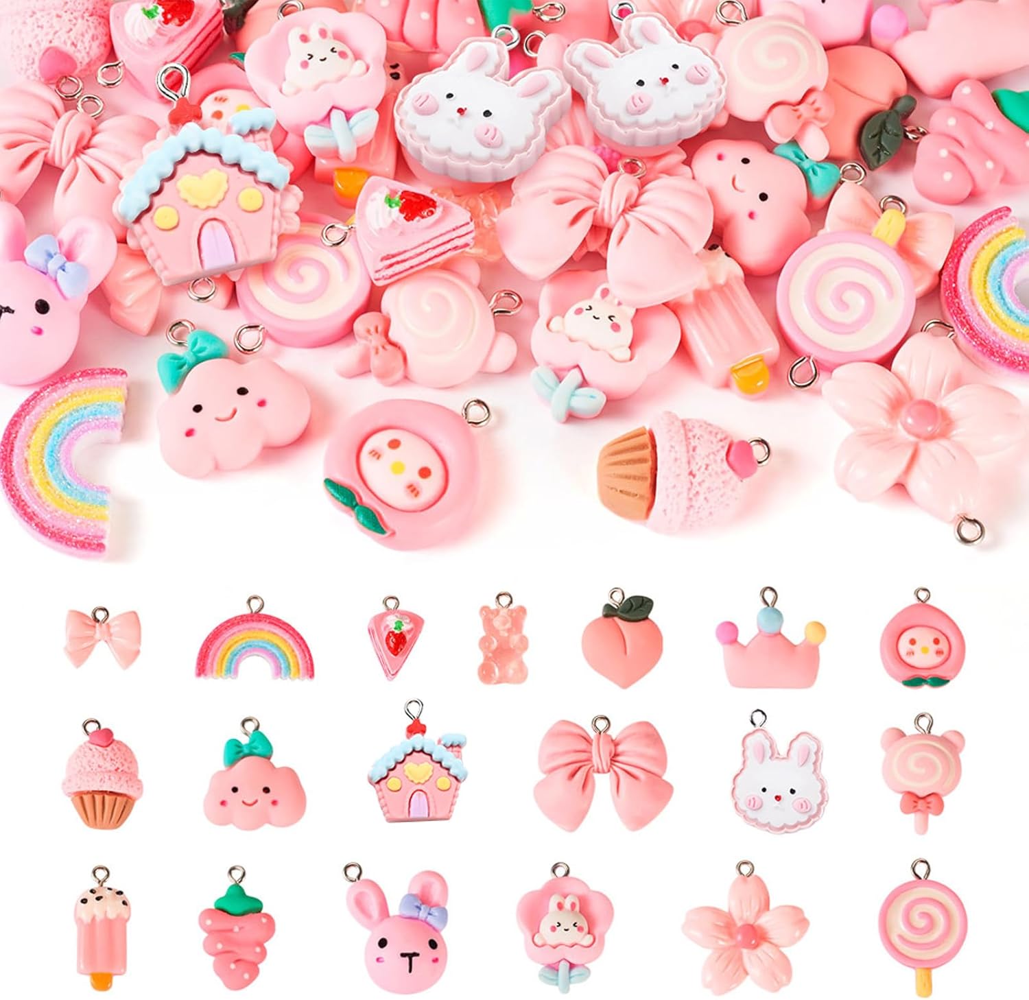 Beadthoven 38pcs 19 Styles Resin Charms: Pink Rabbit Cake Sunflower Bowknot Mini Cute Animal Food Fruit Dangle Charms for Jewelry Making