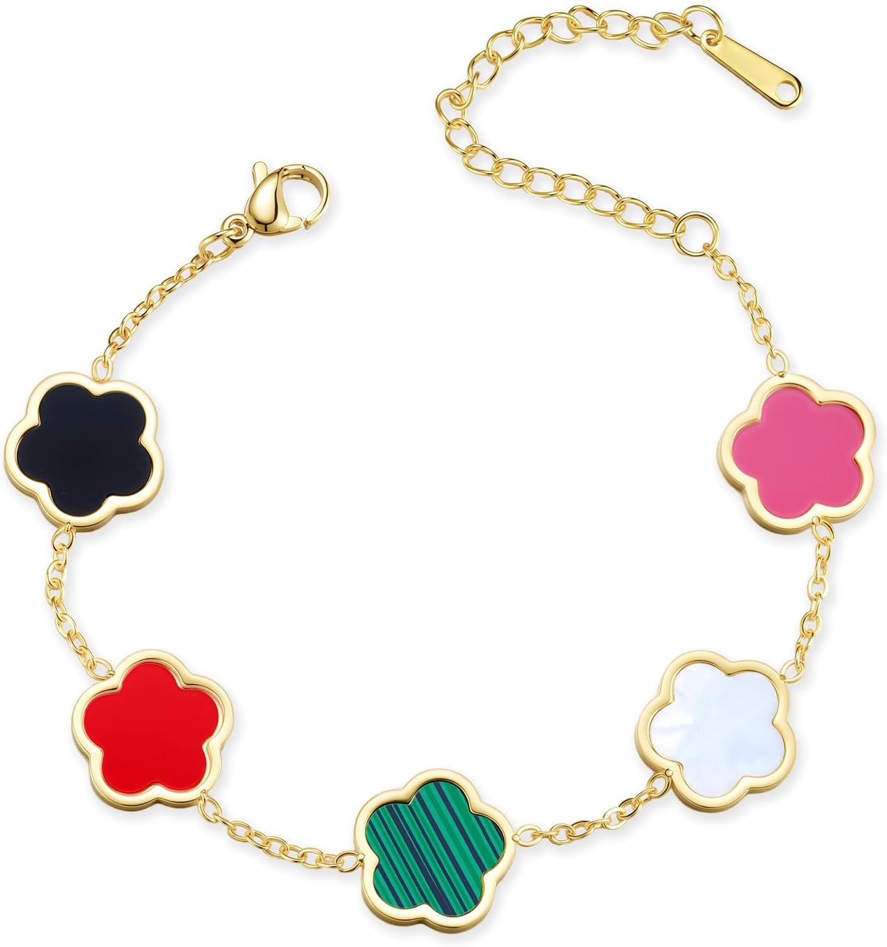 14K Gold-plated Clover Lucky Bracelet Women's Black/White/Pink/Colorful Flower Five Leaf Chain Bracelet Fashion Jewelry Gift -Hypoallergenic Charm for Birthdays, Holiday & Daily Wear