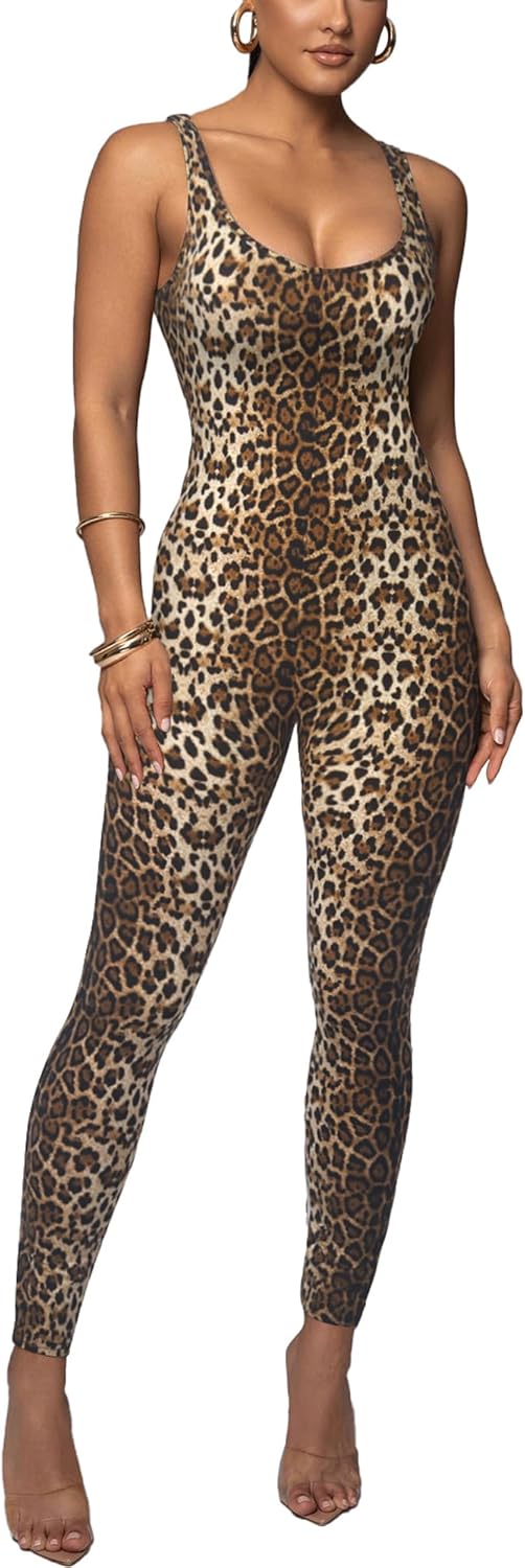 Leopard Print One Piece Jumpsuits for Women Elegant Bodycon Rompers Sexy Club Workout Full Bodysuit