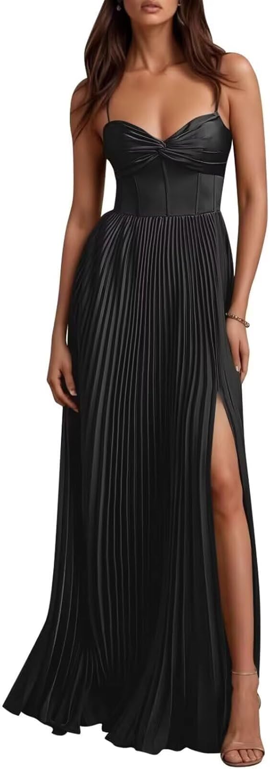 Pleated Satin Bridesmaid Dresses for Women Spaghetti Strap Long Prom Formal Dress with Slit