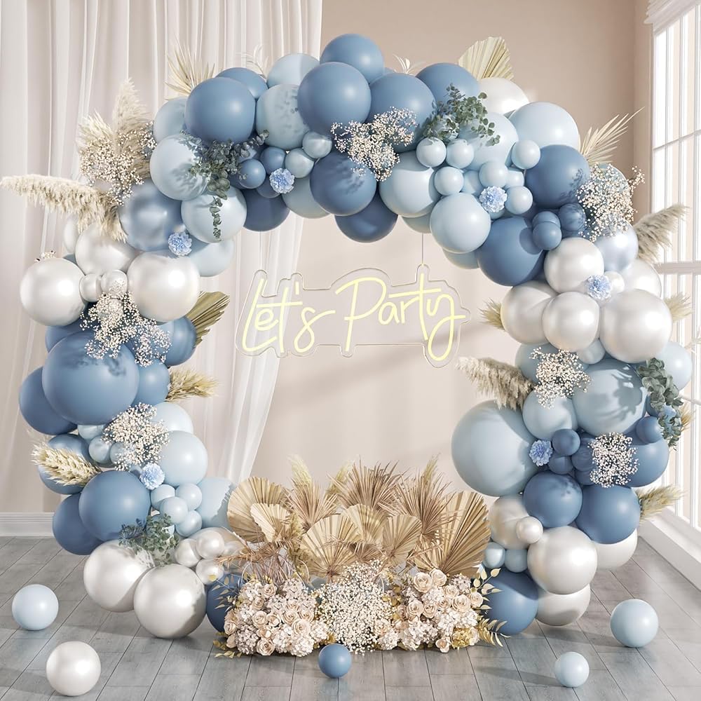 - Package Include: The blue balloon arch kit contains 51pcs dusty blue balloons(18inchx1, 12inchx20, 5inchx30), 46pcs baby blue balloons(18inchx1, 12inchx20, 5inchx25), 10inch pearl white balloonsx15, 10inch pearl pastel blue balloonsx15, glue dotsx60, ribbonx1, decorative stripx1
