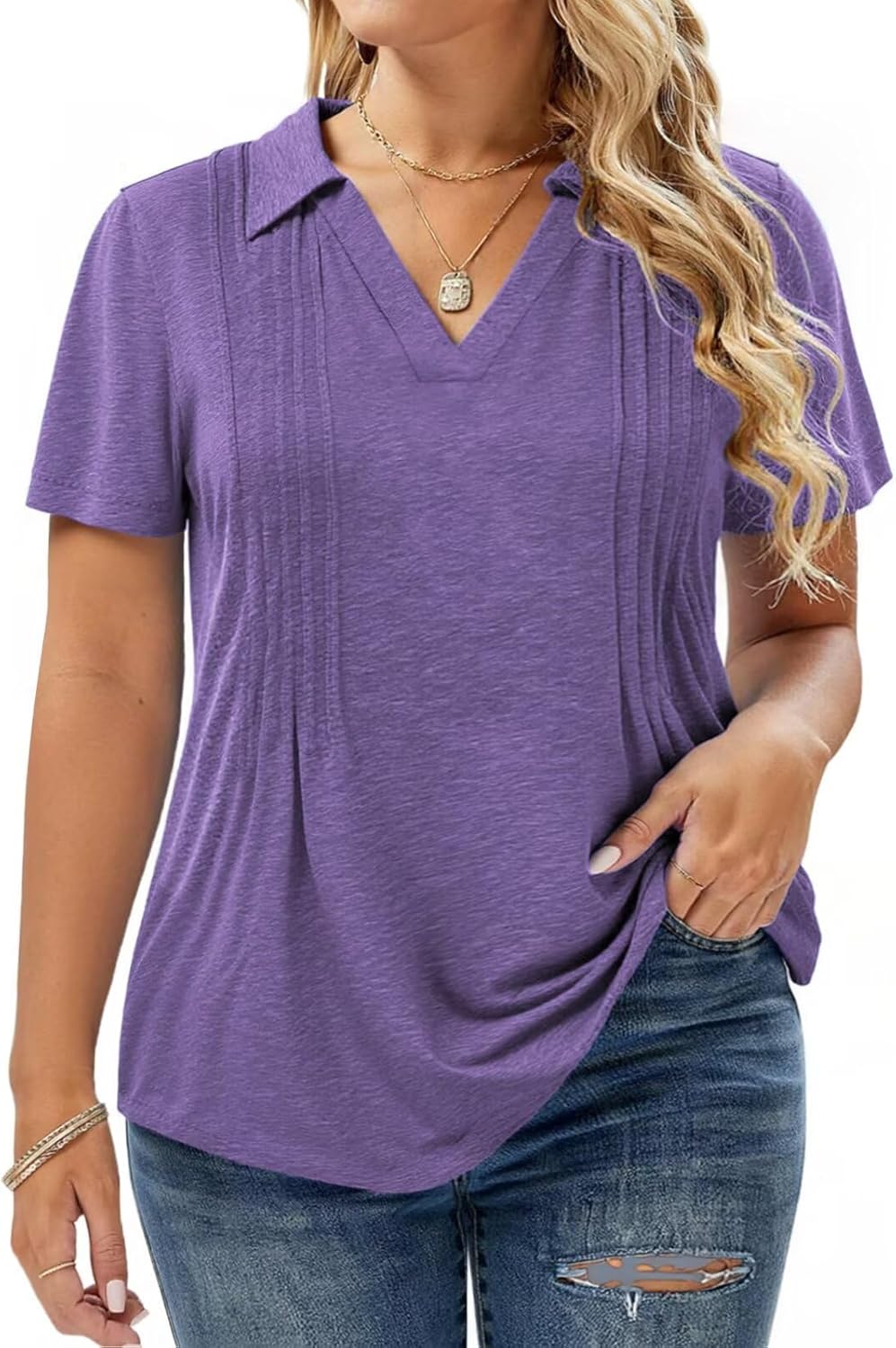 Plus-Size-Summer-Tops for Women Casual Collared V Neck Polo Shirts Business Pleated Tunics Trendy Short Sleeve Blouses