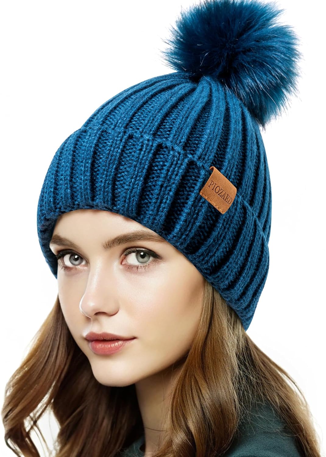 Womens Winter Beanie Hat Fleece Lined Warm Skull Cap with Faux Fur Pom Cuff Knitted Hat for Women