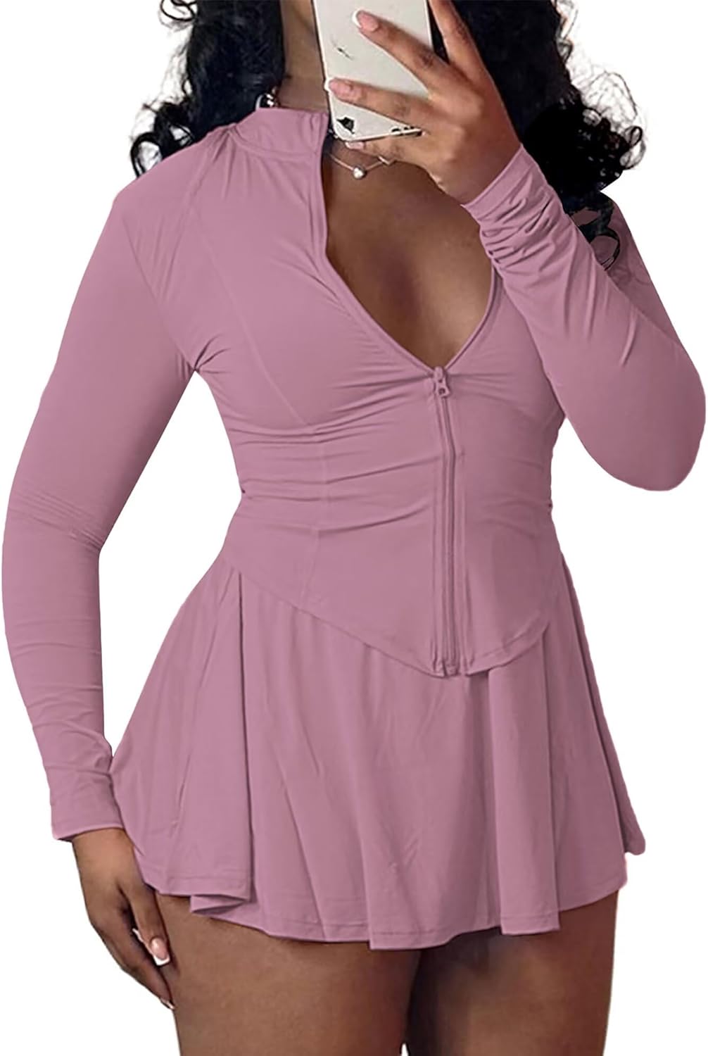 Adogirl Womens Sexy Flared Tennis Skirt Sets Slim Zip Up Jacket 2 Piece Outfits Athletic Matching Mini Dress with Shorts