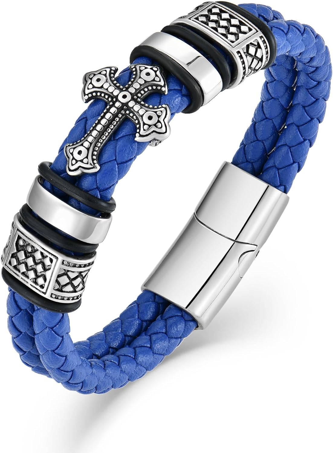 Mens Christian Cross Double Row Leather Bracelet, Religious Braided Cuff Bracelet for Men