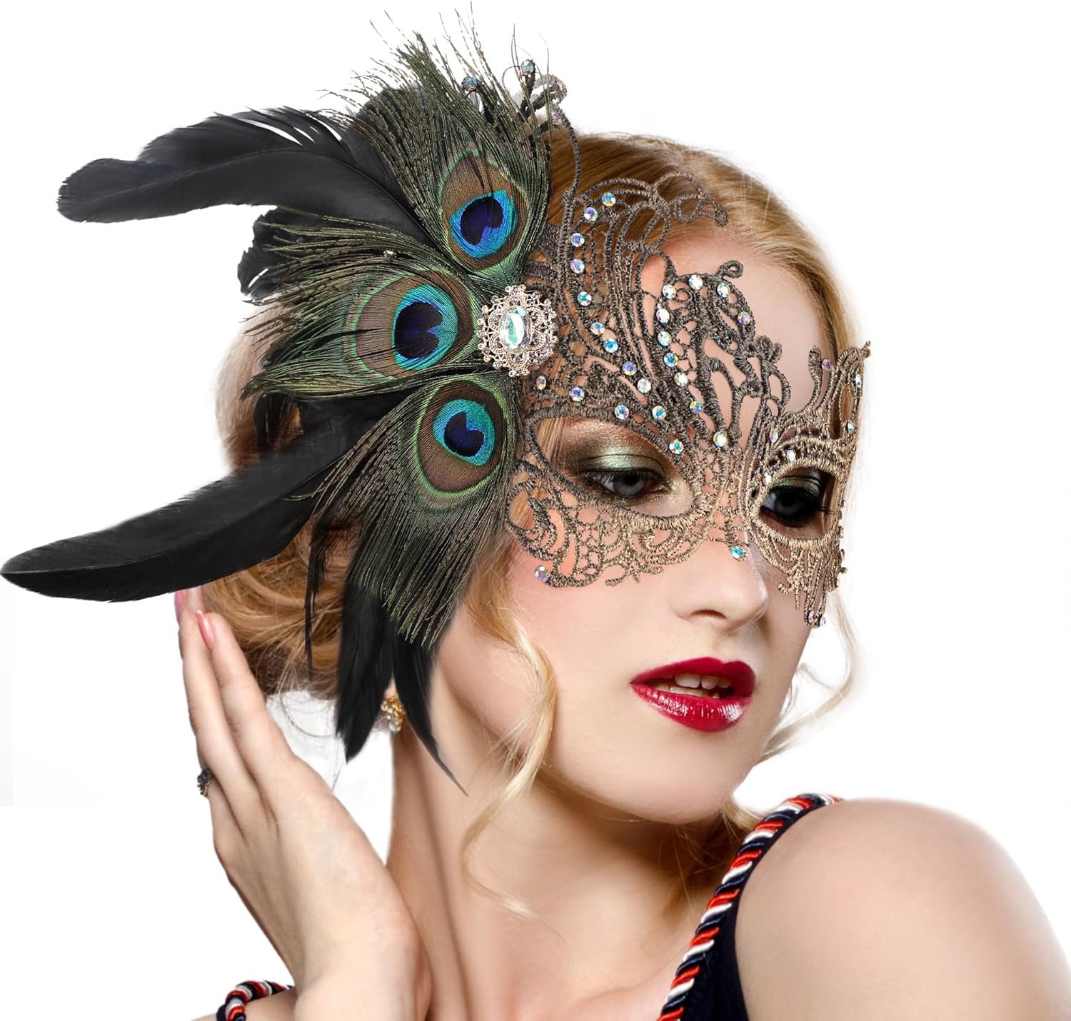 Lace Masquerade Masks for Women - 1920s Peacock Feather Venetian Mask for Halloween Couples Carnival Ball