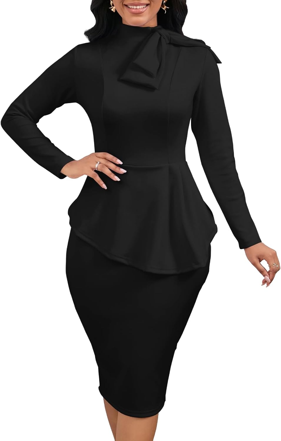 Women's Peplum Pencil Dresses Midi Bodycon Long Sleeve Crew Neck Modest Business Church Work Dress Elegant