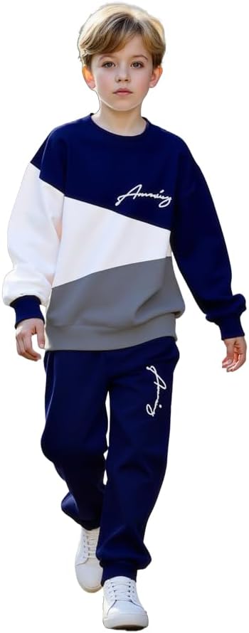 Boys Casual Color Block Sweatshirt Sets, Font Pattern Print Top and Long Pants Fall Winter Outfits for Kids 8-12T