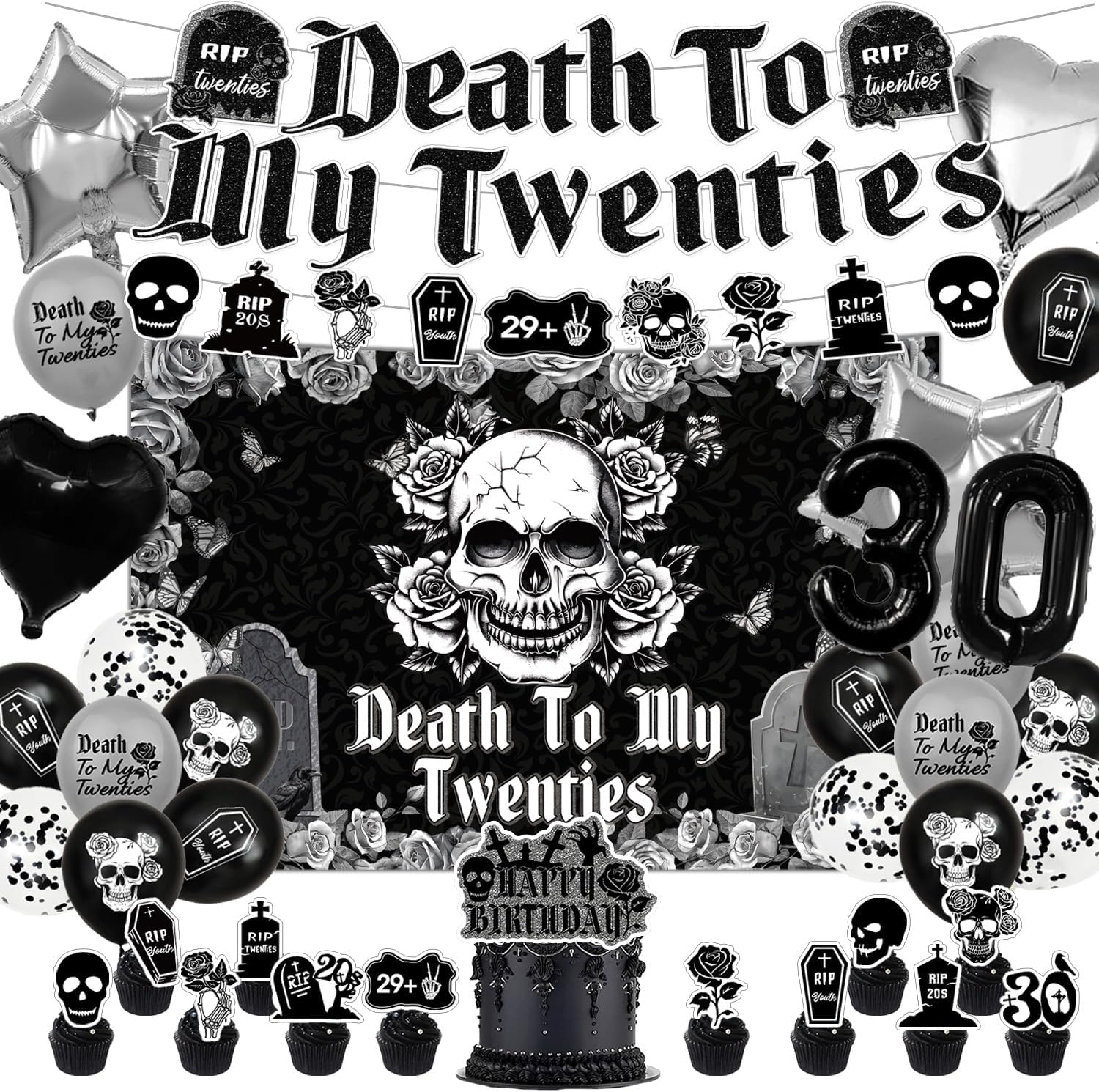 - 【Reliable Materials】Our death to your 20s decorations are made of materials, thick and solid, it is not easy to break and can be reused. The surfaces of the black and silver balloons are printed clearly and the colors are bright, making your party more enjoyable.