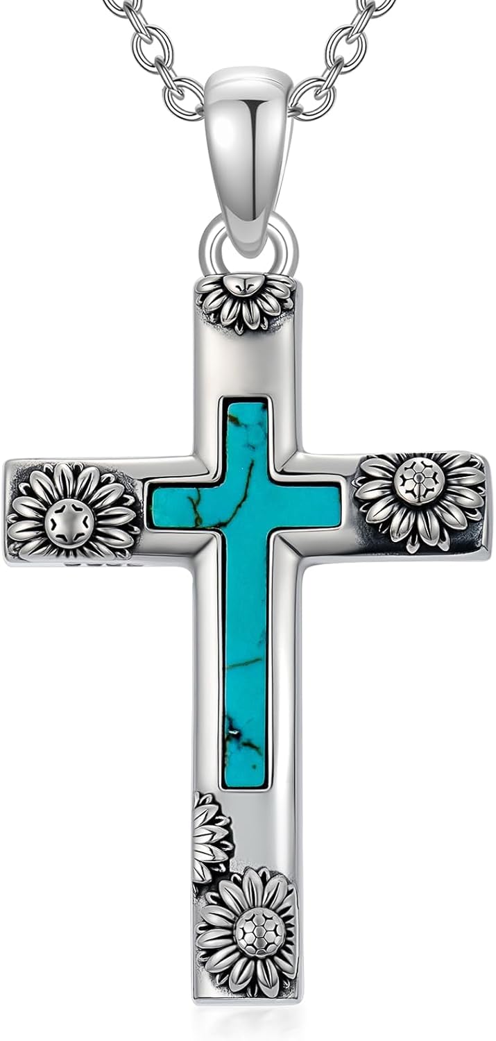 Turquoise Cross Necklace 925 Sterling Silver Vintage Sunflower Turquoise Religious Cross Pendant Jewelry for Women