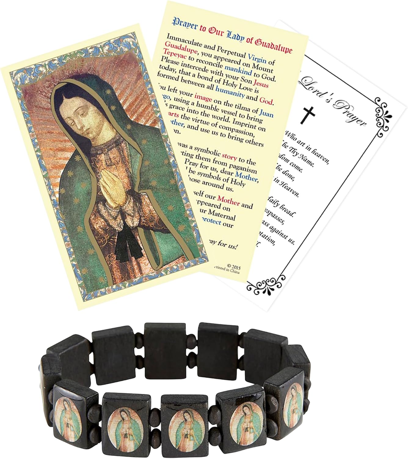 Trendzeen Virgin Mary Bracelet - Our Lady Of Guadalupe Card, The Lord's Prayer - Black Wood Virgen De Guadalupe Bracelet with Catholic Holy Cards - Set of 3 Items