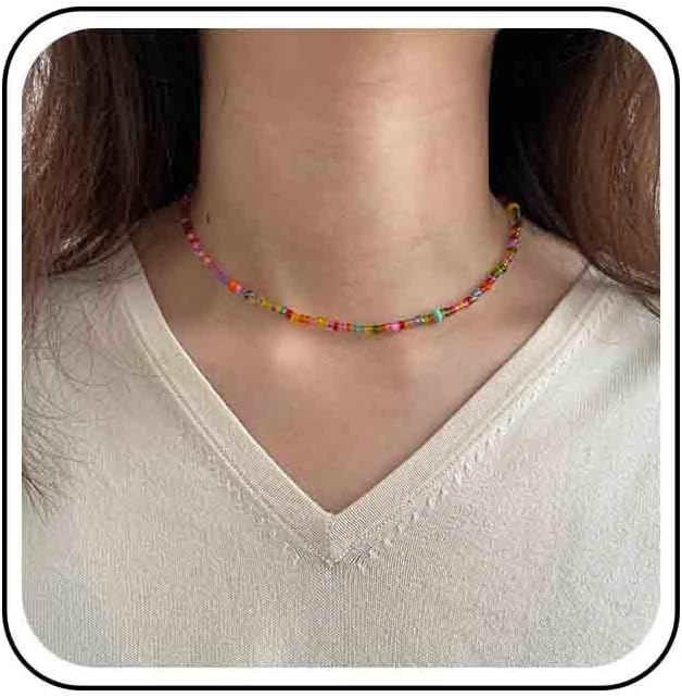 Vintage Colorful Seed Bead Choker Necklace Mutil Color Gemstone Choker Necklace Rainbow Bead Necklace Short Seed Bead Necklace for Women and women