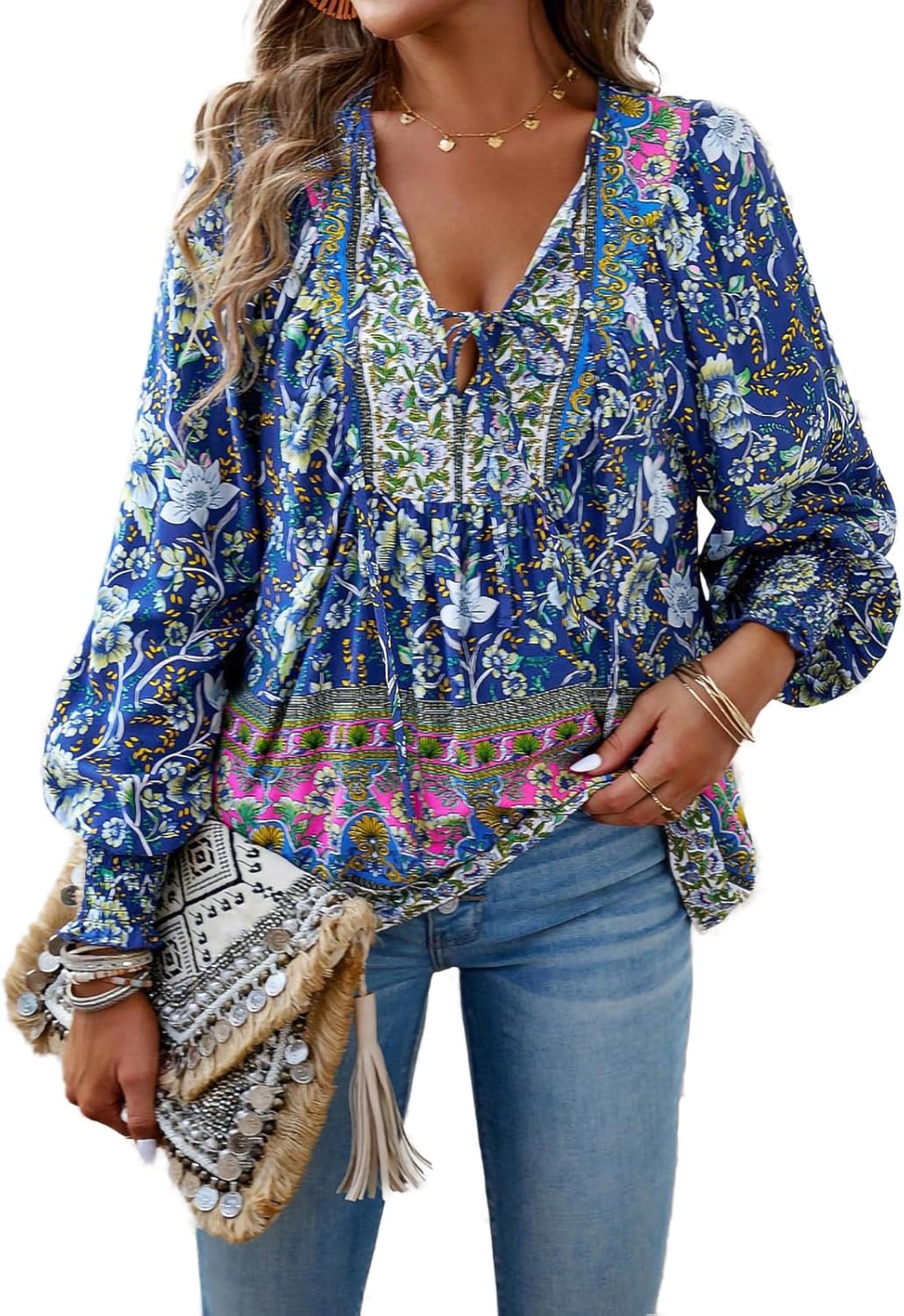 Vintage Womens Boho Shirts Trendy Floral Print Casual Fall Tops V Neck Long Sleeve Vacation Beach Spring Blouses