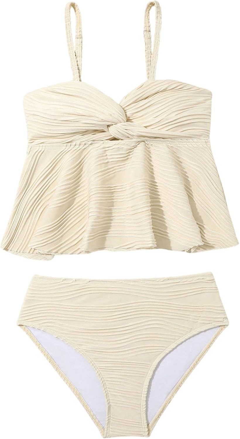 OYOANGLE Girl's 2 Piece Tankini Swimsuit Textured Twist Front Ruched Ruffle Bikini Set Bathing Suits