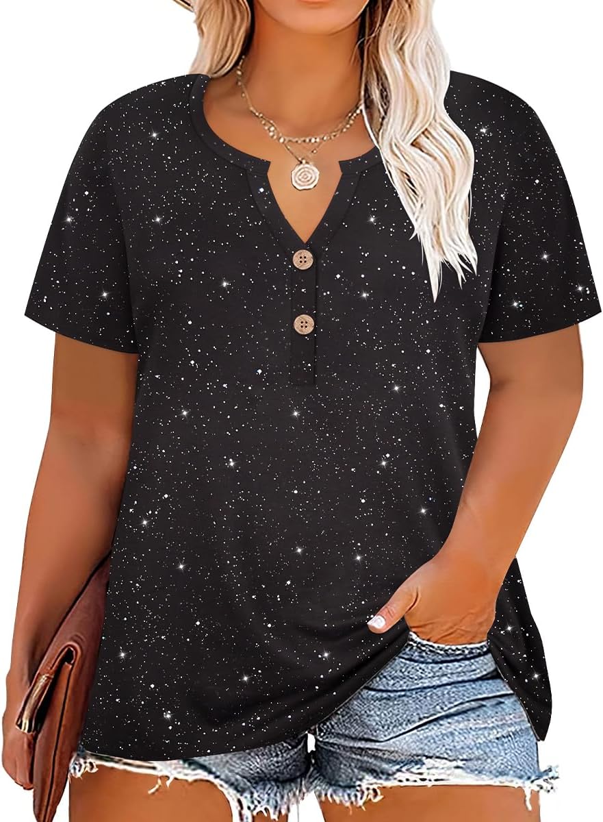 RITERA Plus Size Tops for Women V Neck Button Up Short Sleeve Henley Tshirt Casual Blouse Pullover Basic 12W 14W XL-5XL