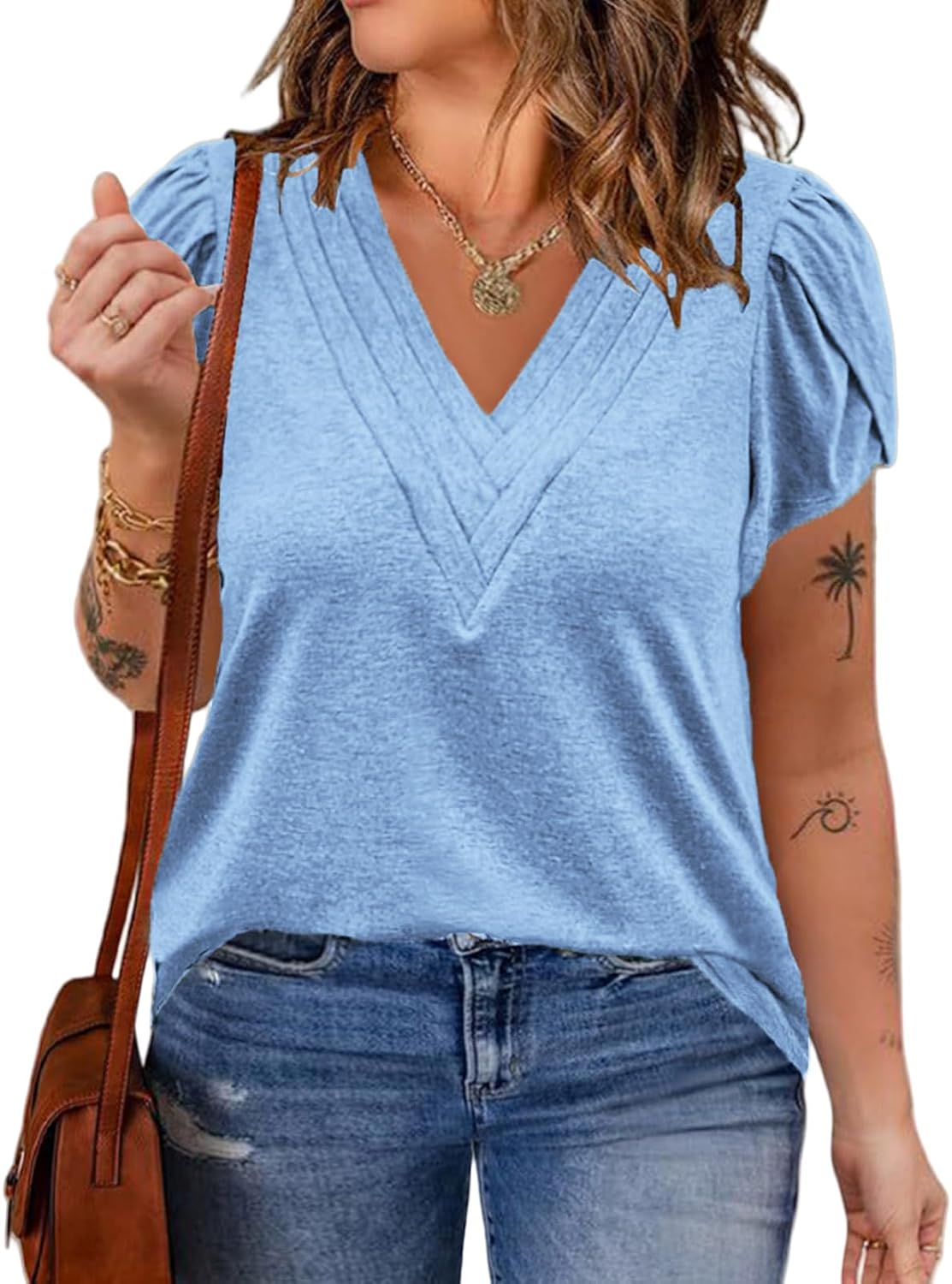 VISLILY Womens-Plus-Size-Summer-Tops Casual Petal Short Sleeve T Shirts Trendy V Neck Blouses Flowy Dressy Tunics XL-5XL