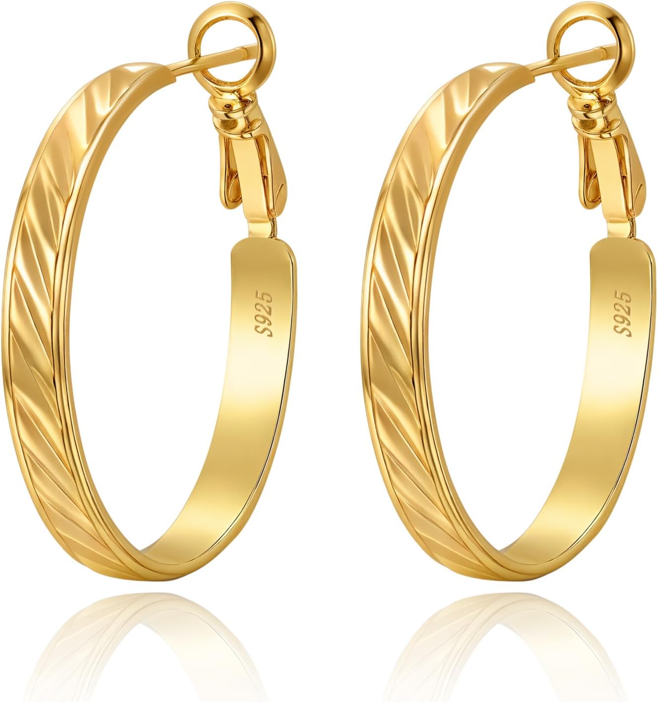 Twill Gold Silver Hoop Earrings for Women, Hypoallergenic 14K Gold Plated Hoops, Lightweight 925 Sterling Silver Post Big Earrings for Women Jewelry Gifts 30/40/50/60MM