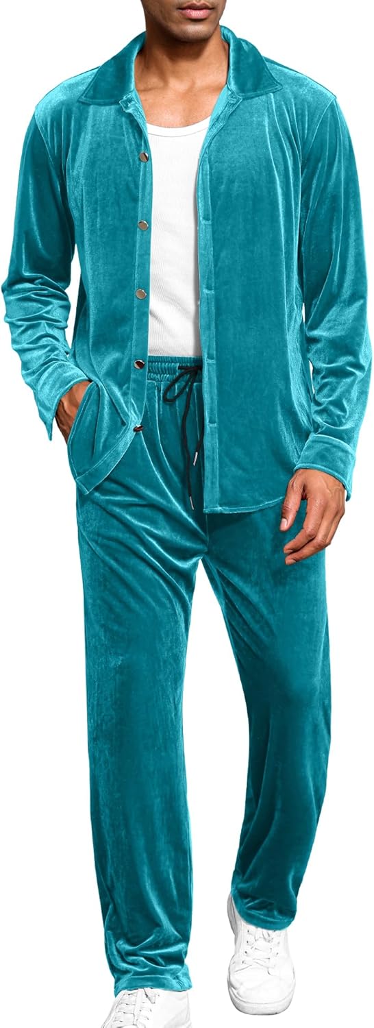 LecGee Men Fall Casual Sets Velvet Long Sleeve Button Down Shirt Elastic Waist Velour Pants 2 Piece Outfits Tracksuit