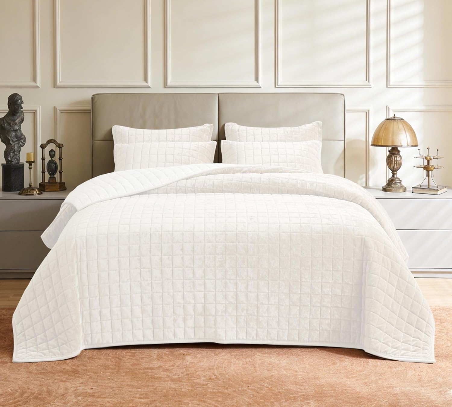 Luxurious Velvet Quilt Oversize King Size Set 120"x128" Ultra Soft Bedding Set Quilted Bedspread Coverlet with 2 Matching Pillow Shams for All Seasons,Cream White
