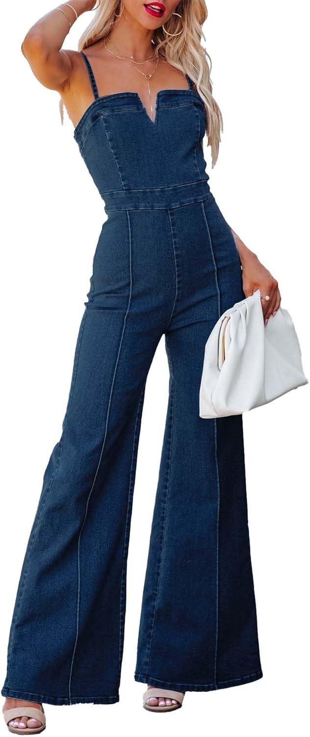 xxxiticat Women's Denim Jumpsuit Sleeveless Spaghetti Straps V Neck Wide Leg Flared Pants One Piece Overalls Jeans Romper