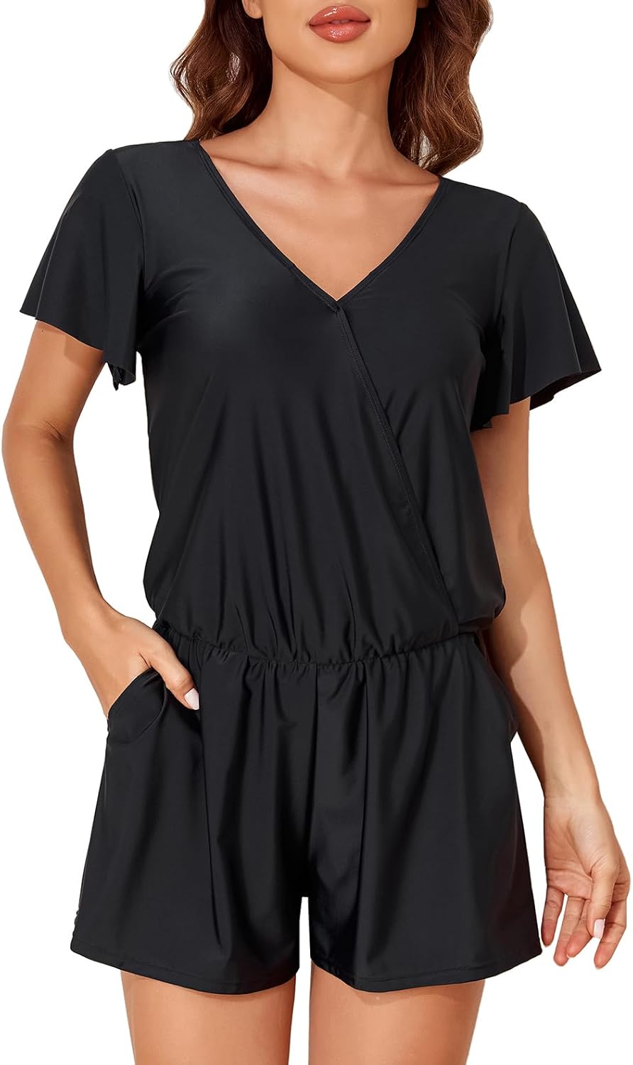 Smismivo Swim Romper with Built in Bra and Pockets One Piece Swimsuit Shorts Modest Bathing Suit for Women