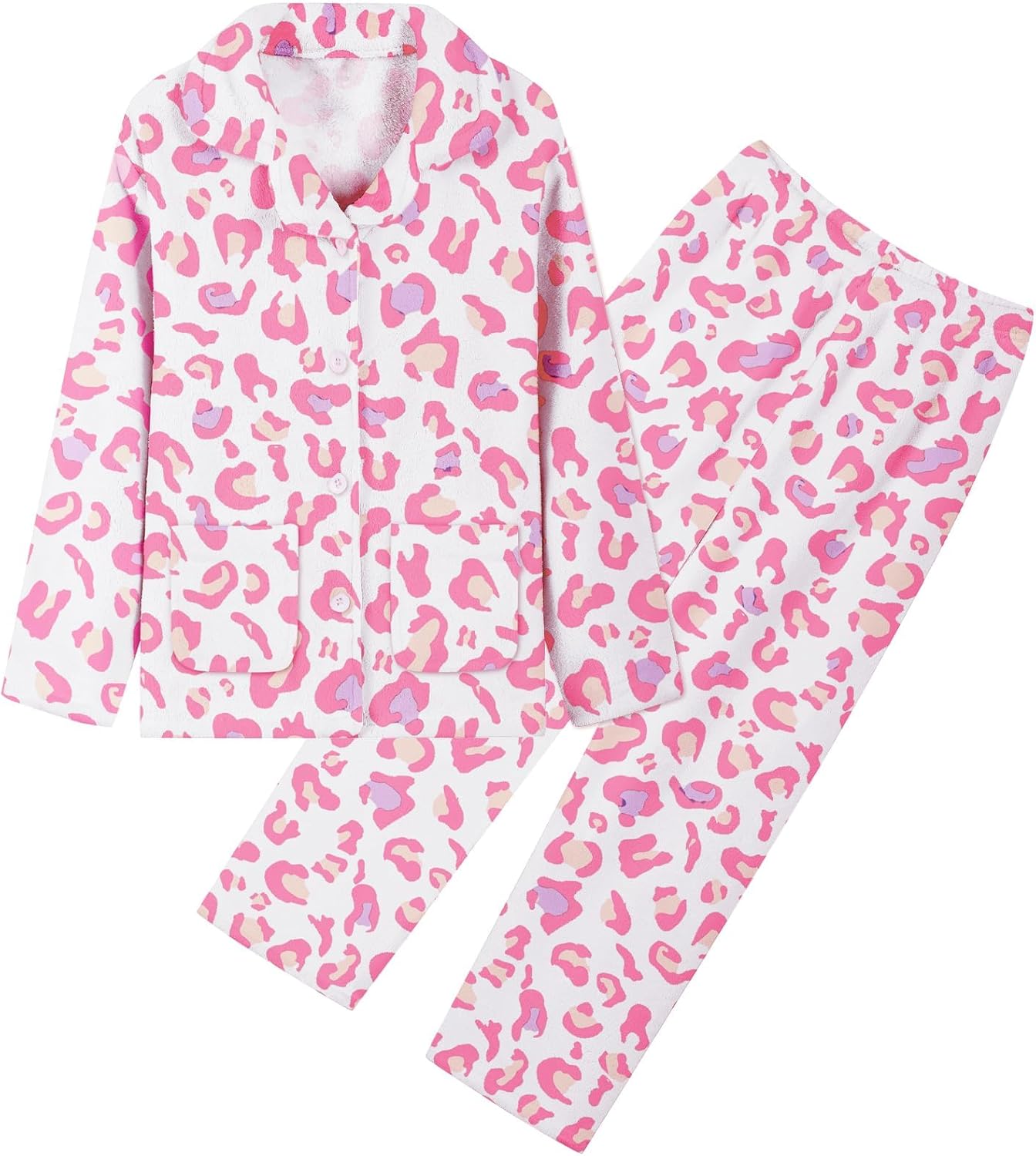 Umeyda Girls Fleece Pajamas Long Sleeve Flannel Button Down Sleepwear Kids Soft Fuzzy 2 Pieces Pjs Loungewear Sets