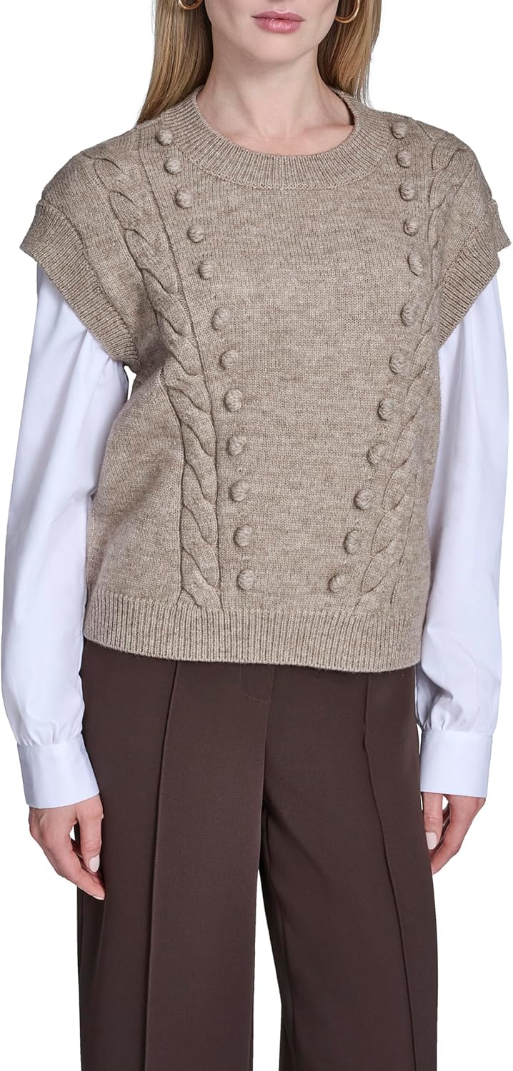 BCBG Womens Crewneck Sweater Vest with Woven Sleeves