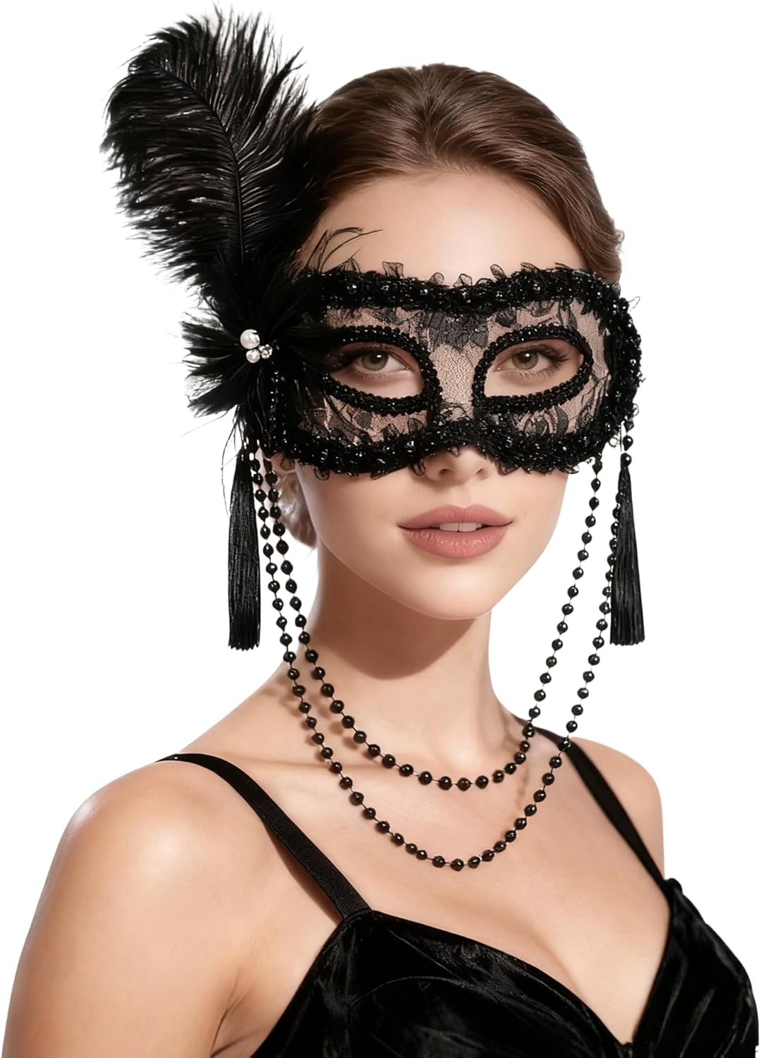Venetian Masquerade Mask for Women - Feather Masks with Pearl Tassels, Party Eyemask for Halloween Renaissance