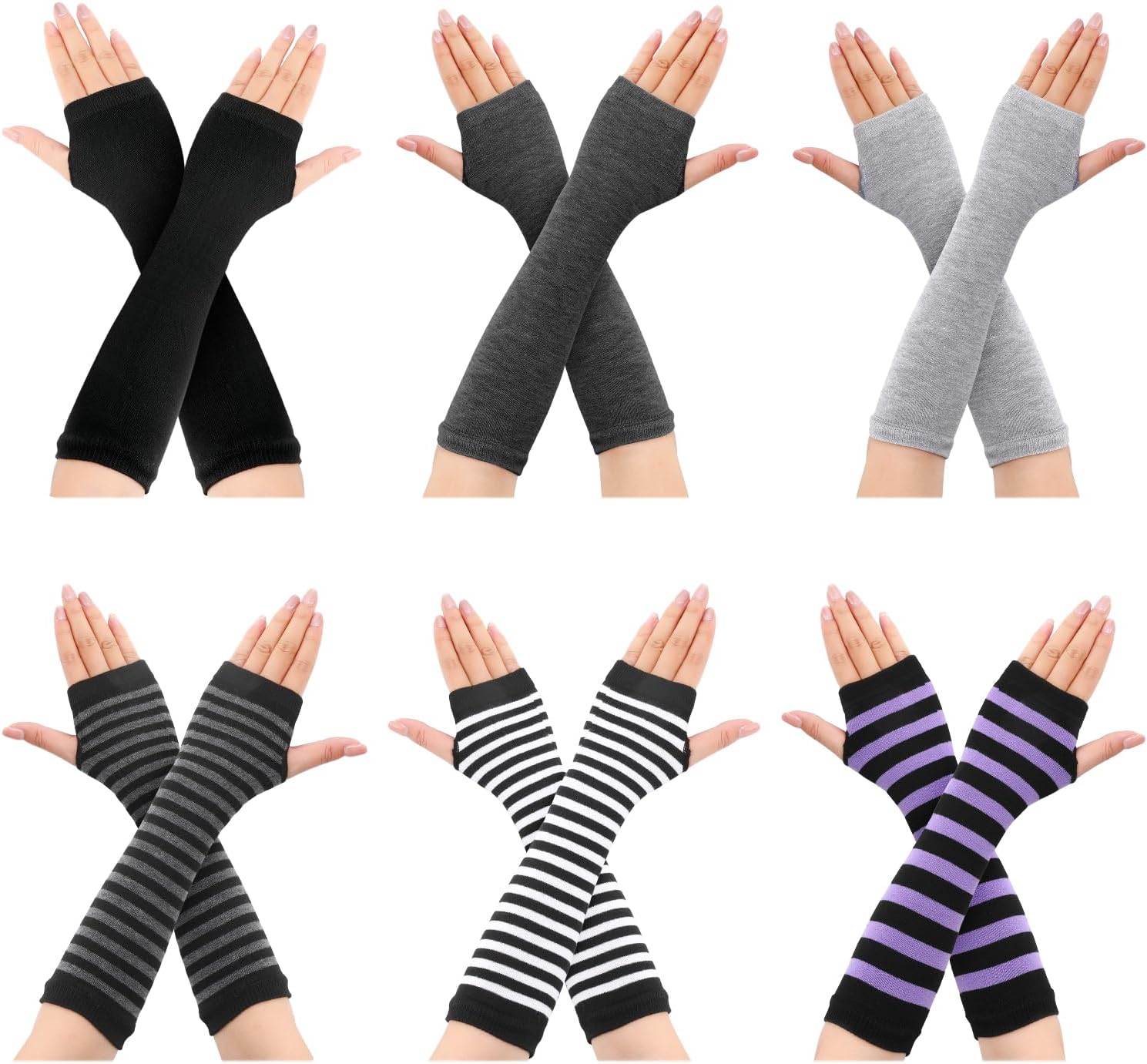 6 Pairs Punk Gothic Long Fingerless Gloves Striped Knit Arm Warmers Elbow Length Thumb Hole Gloves for Women