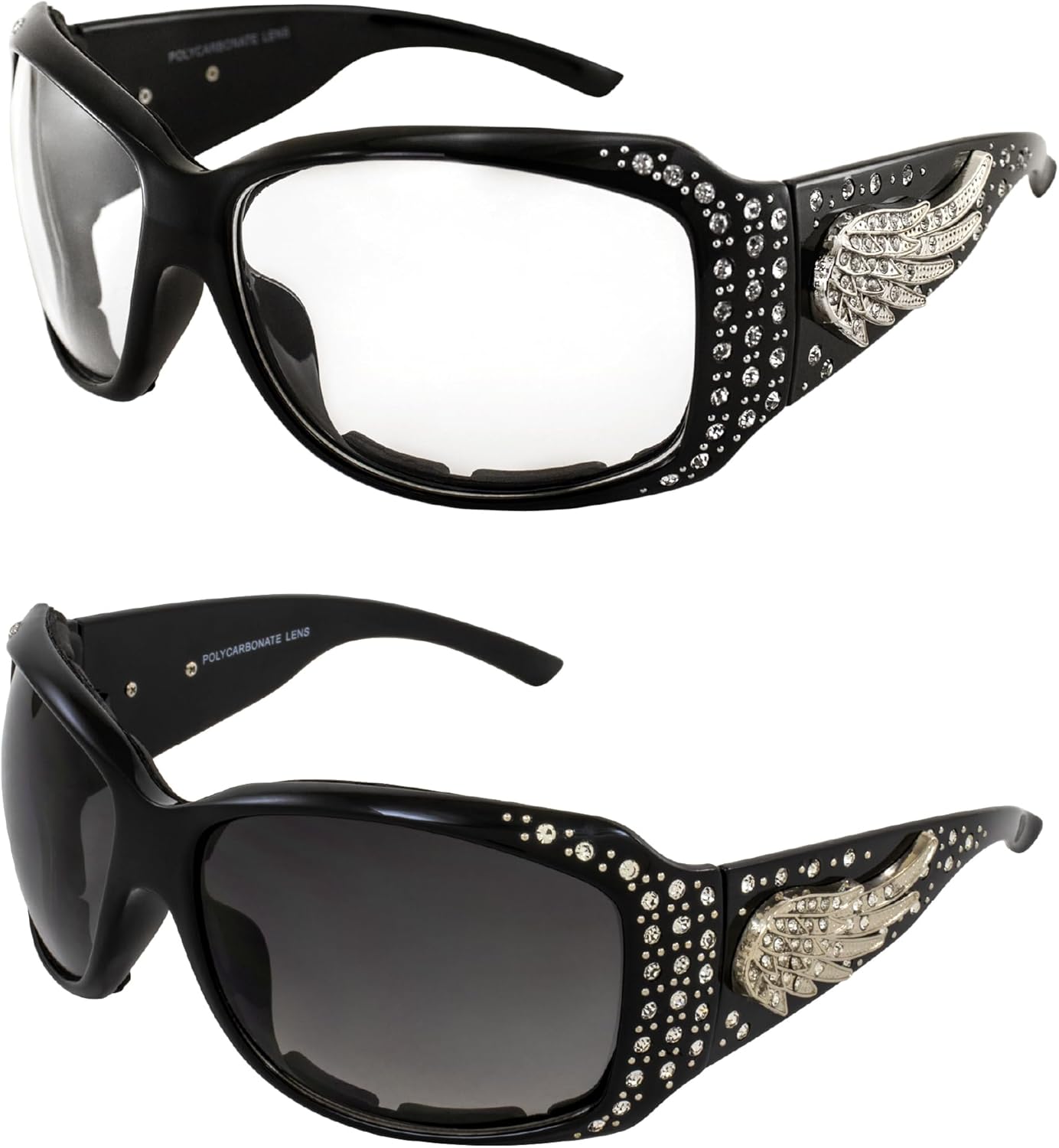 Rodeo Queen Angel Plus Padded Motorcycle Sunglasses Womens 2 Pair Black Frame Rhinestone Sunglasses w/Silver Wing Accent Clear & Gradient Smoke Lenses