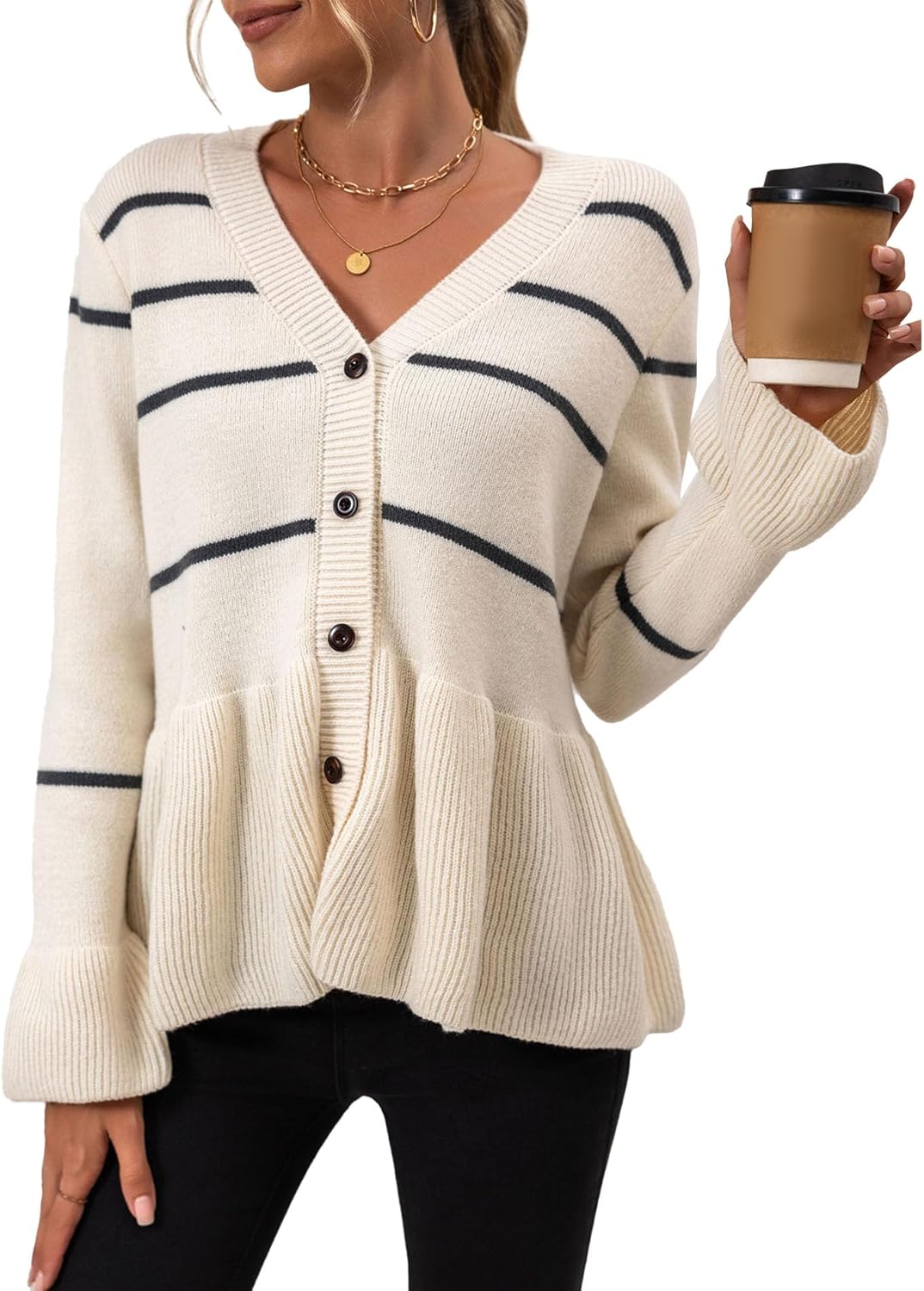 Sexyshine Women's Striped Button Down Peplum Cardigan Casual V Neck Flared Long Sleeve Knit Sweater Jumpers