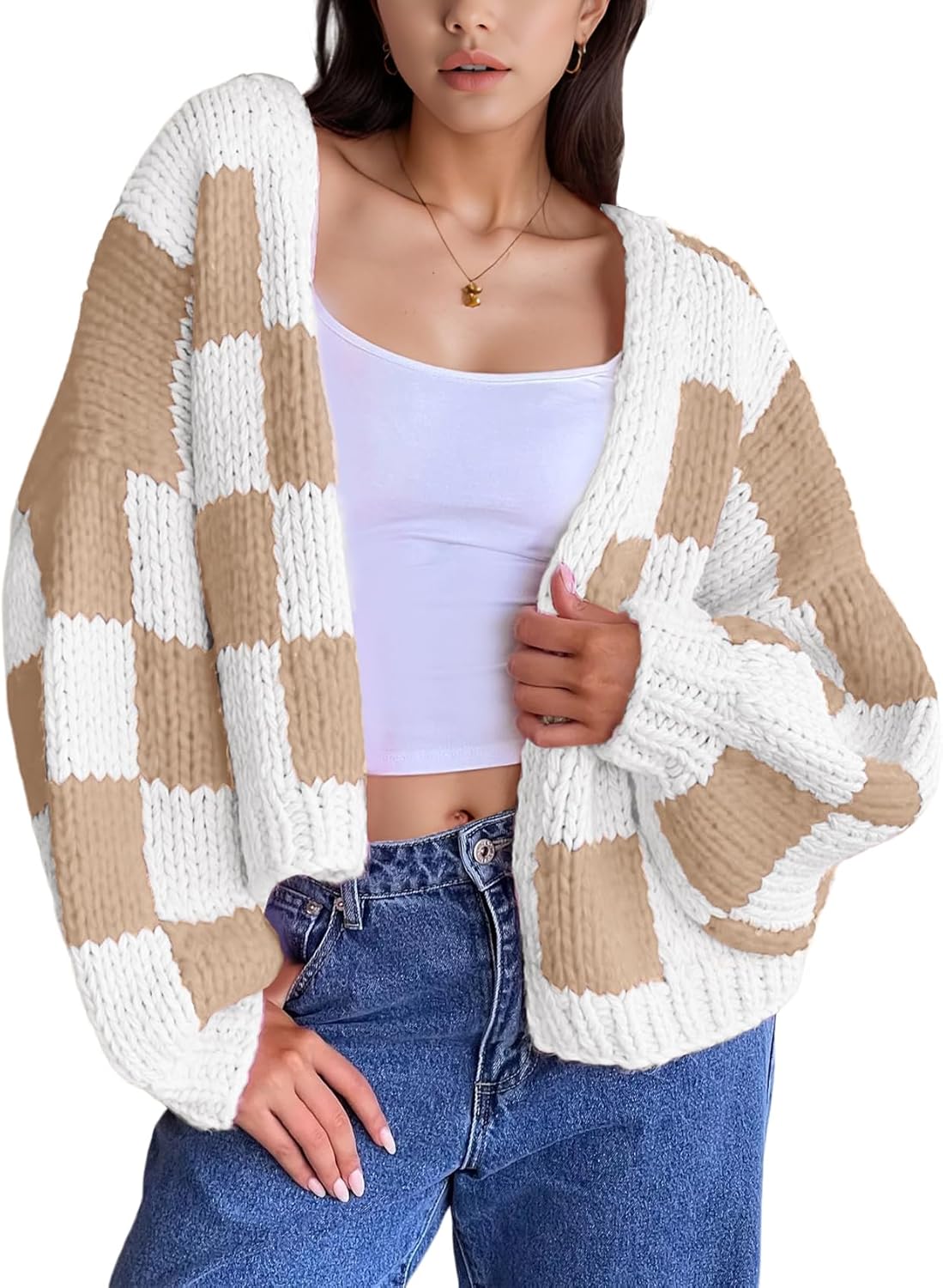 Wyeysyt Checkered Cardigan Sweaters for Women Open Front Long Sleeve Cardigan Cropped Chunky Knit Sweaters Outwear