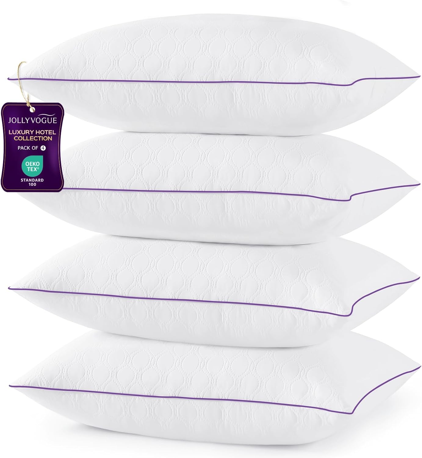 - Easy Care & Long-Lasting: Machine washable and tumble dry low, the JOLLYVOGUE standard bedding pillows set of 4 retains shape and softness after multiple washes. The double-layer design with 1.8oz/yd² of padding in between provides extra durability