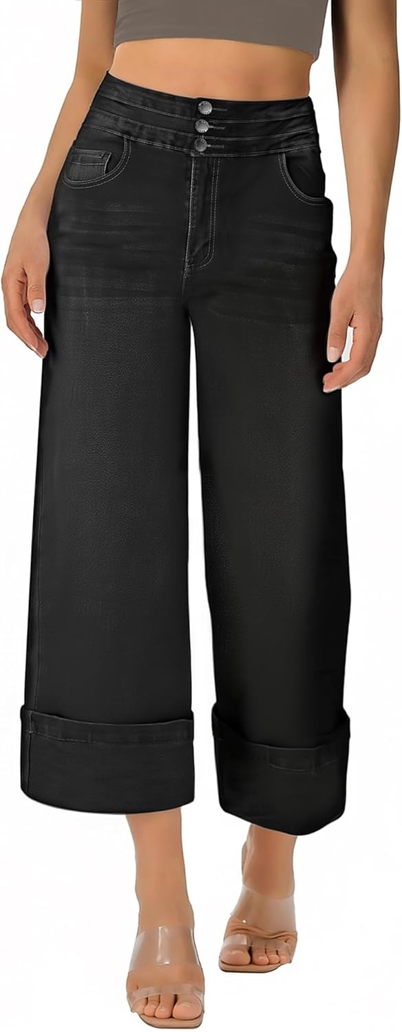 roswear Women's Capri Jeans Stretchy High Waist Wide Leg Cropped Pants with Cuffed Hem
