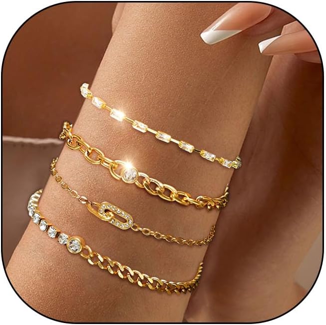 Staligue Gold Bracelets for Women,Waterproof Gold Bracelet Stack Set Dainty 18k Gold Plated Layered Gold Paperclip Link Tennis Chain Bracelet Pack Gifts for Women Girls Adjustable 6.5"+2"