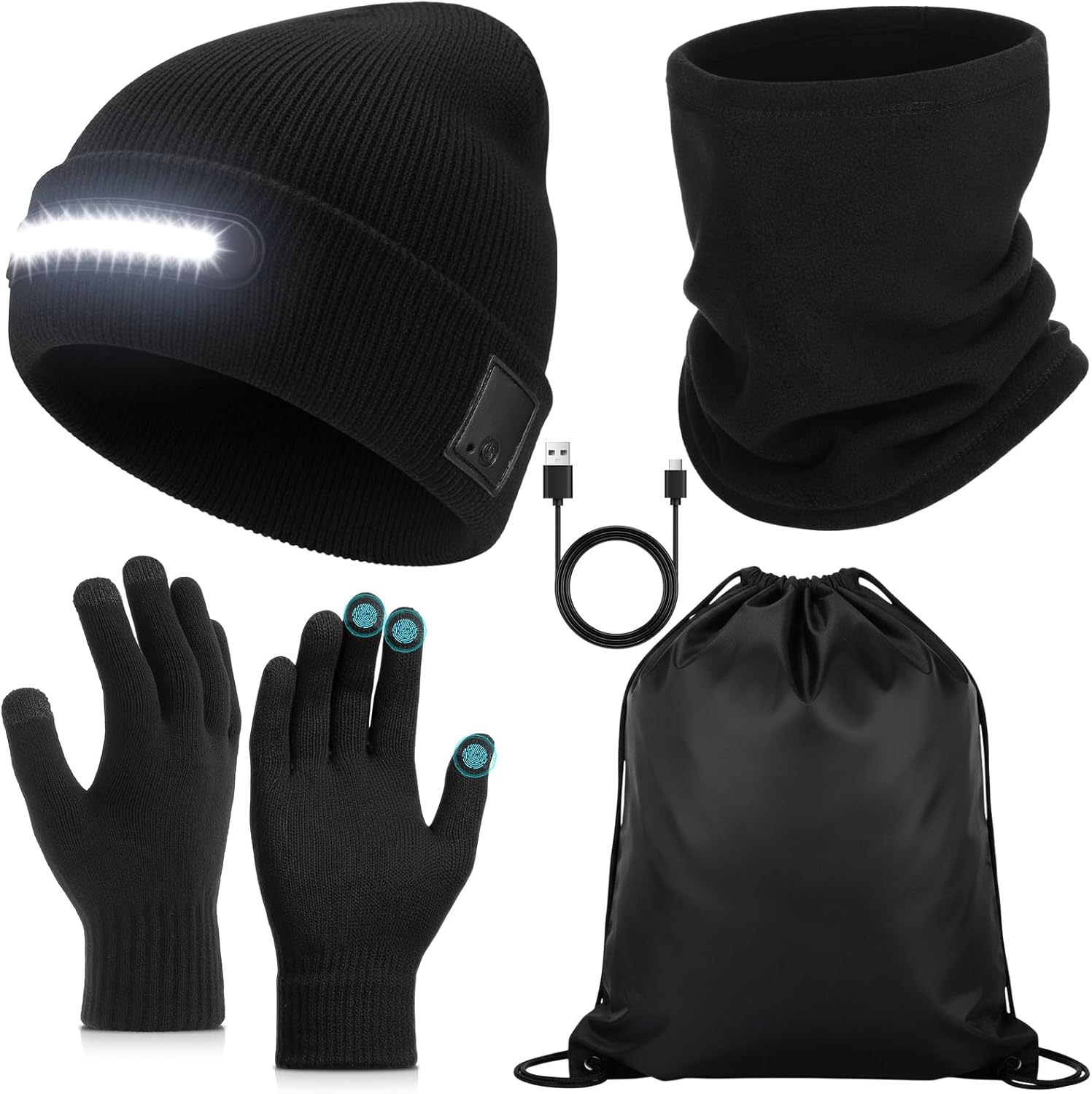 4 Pack Winter LED Beanie with Light USB Rechargeable Unisex Touchscreen Gloves Fleece scarf with Bag for Men Women