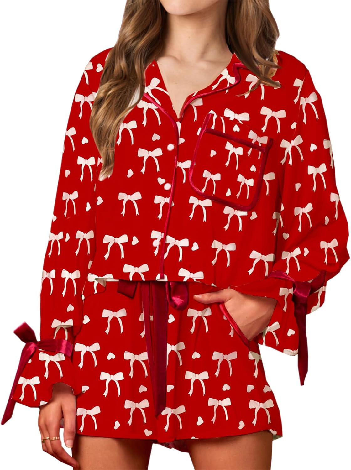 Women's Stripe Satin Pajamas Set Long Sleeve Button-Down Sleepwear Heart Print Shorts Lounge Set