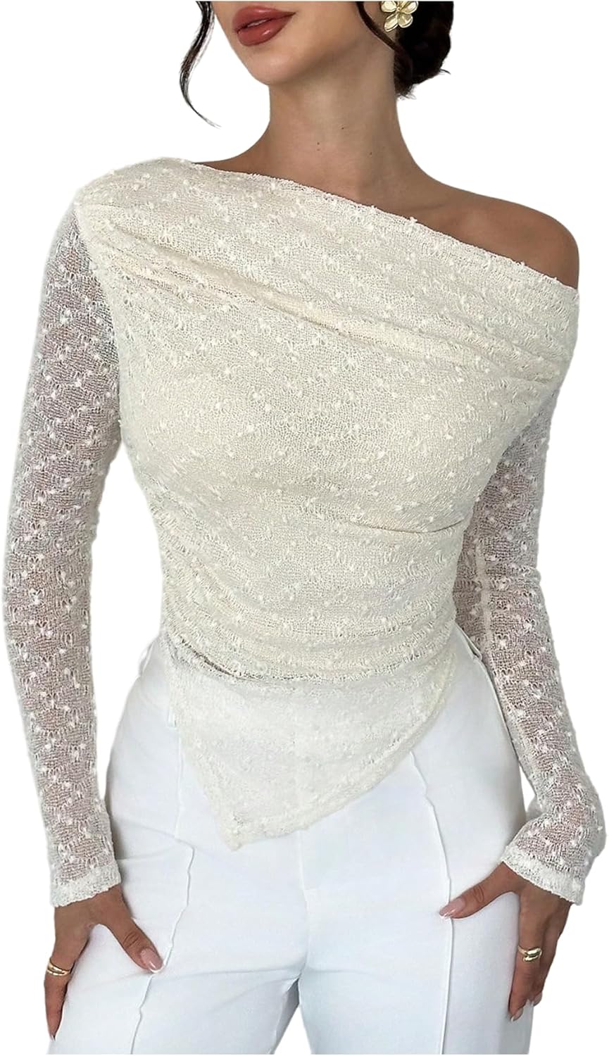 SHENHE Women's Elegant Off The Shoulder Sheer Long Sleeve Top Asymmetrical Ruched Going Out Shirt
