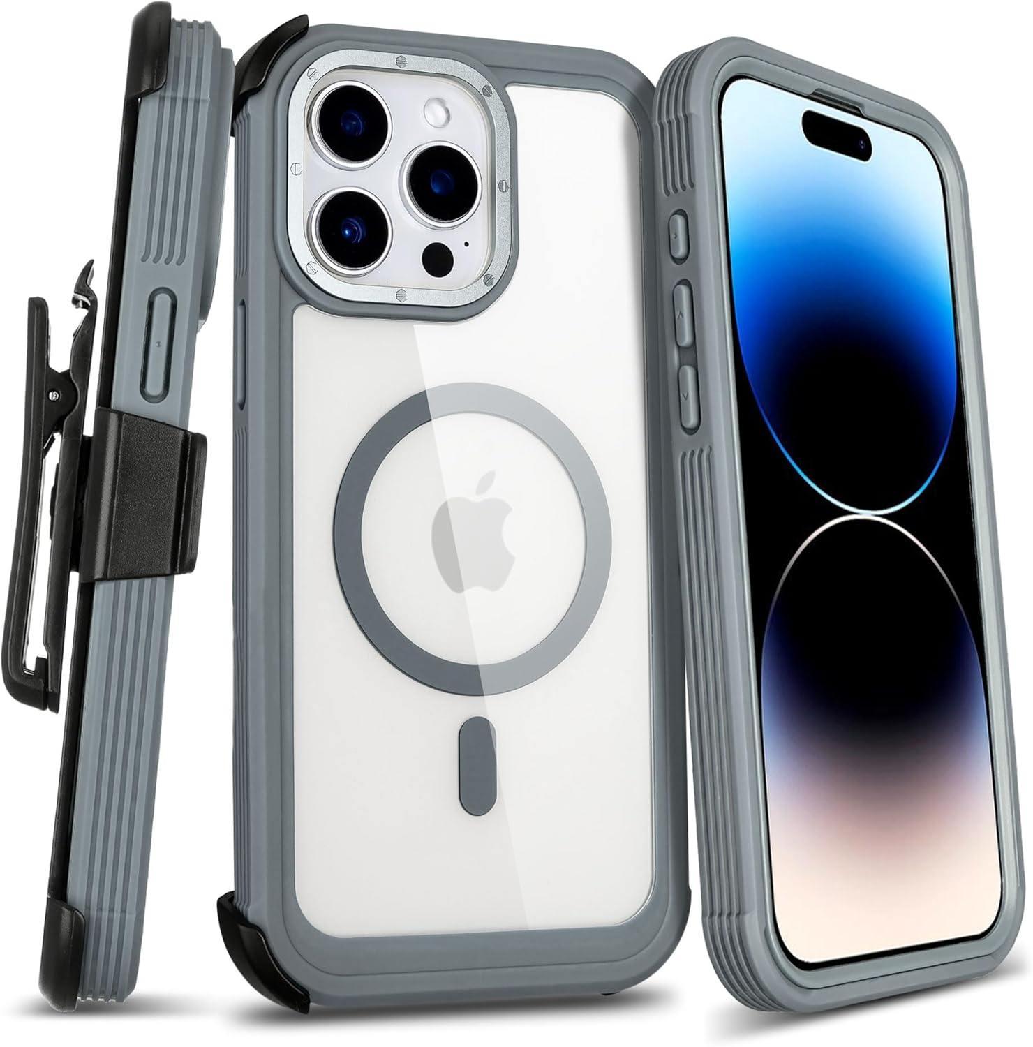Defender for Clear iPhone 14 Pro Max Case with Belt Clip Holster, Compatible with MagSafe, Anti-Yellowing, Full-Body Phone Cover for iPhone 14 Pro Max Case (Clear & Grey)
