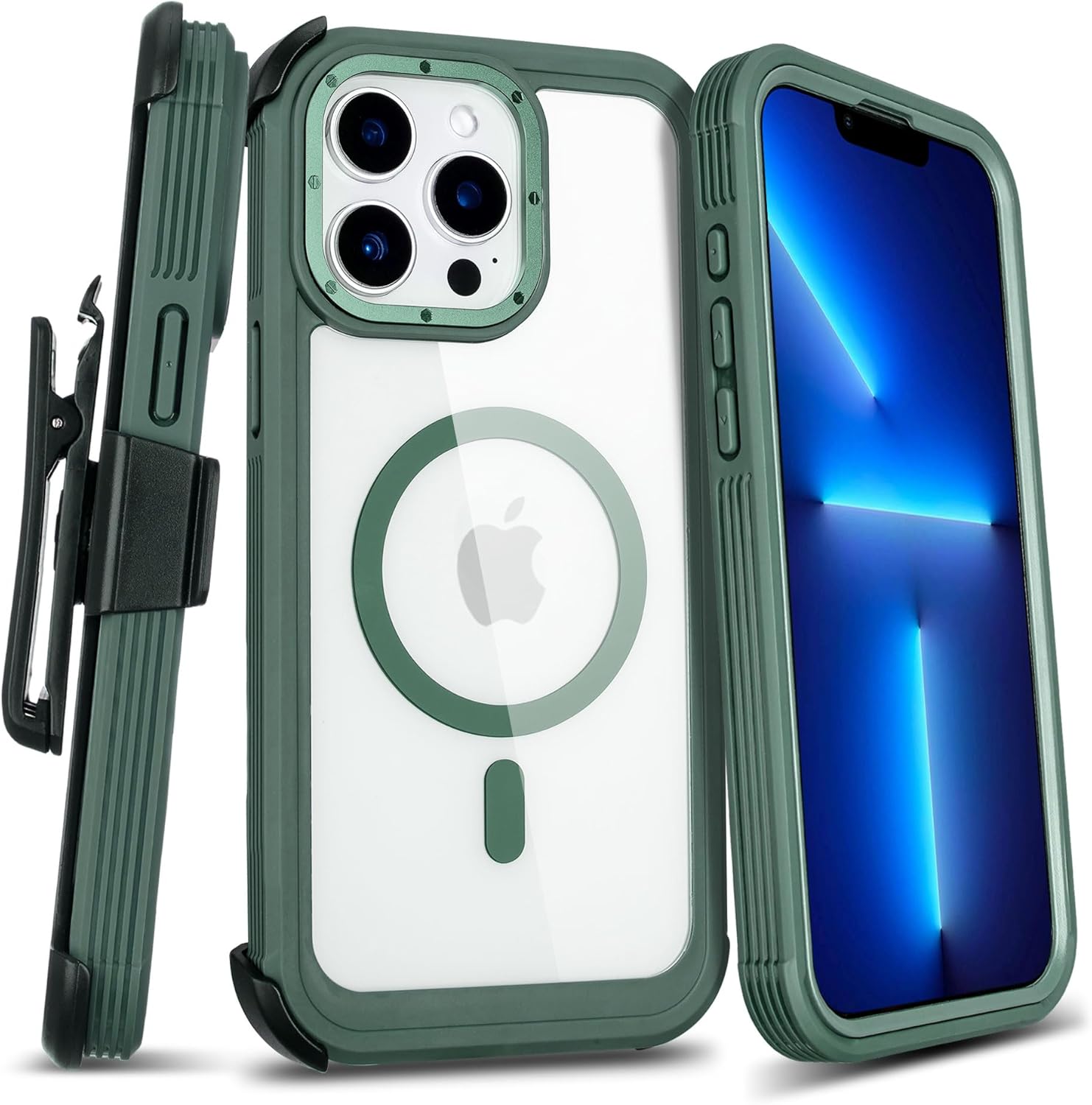 Defender for Clear iPhone 13 Pro Max Case with Belt Clip Holster, Compatible with MagSafe, Anti-Yellowing, Full-Body Phone Cover for iPhone 13 Pro Max Case (Clear & Green)