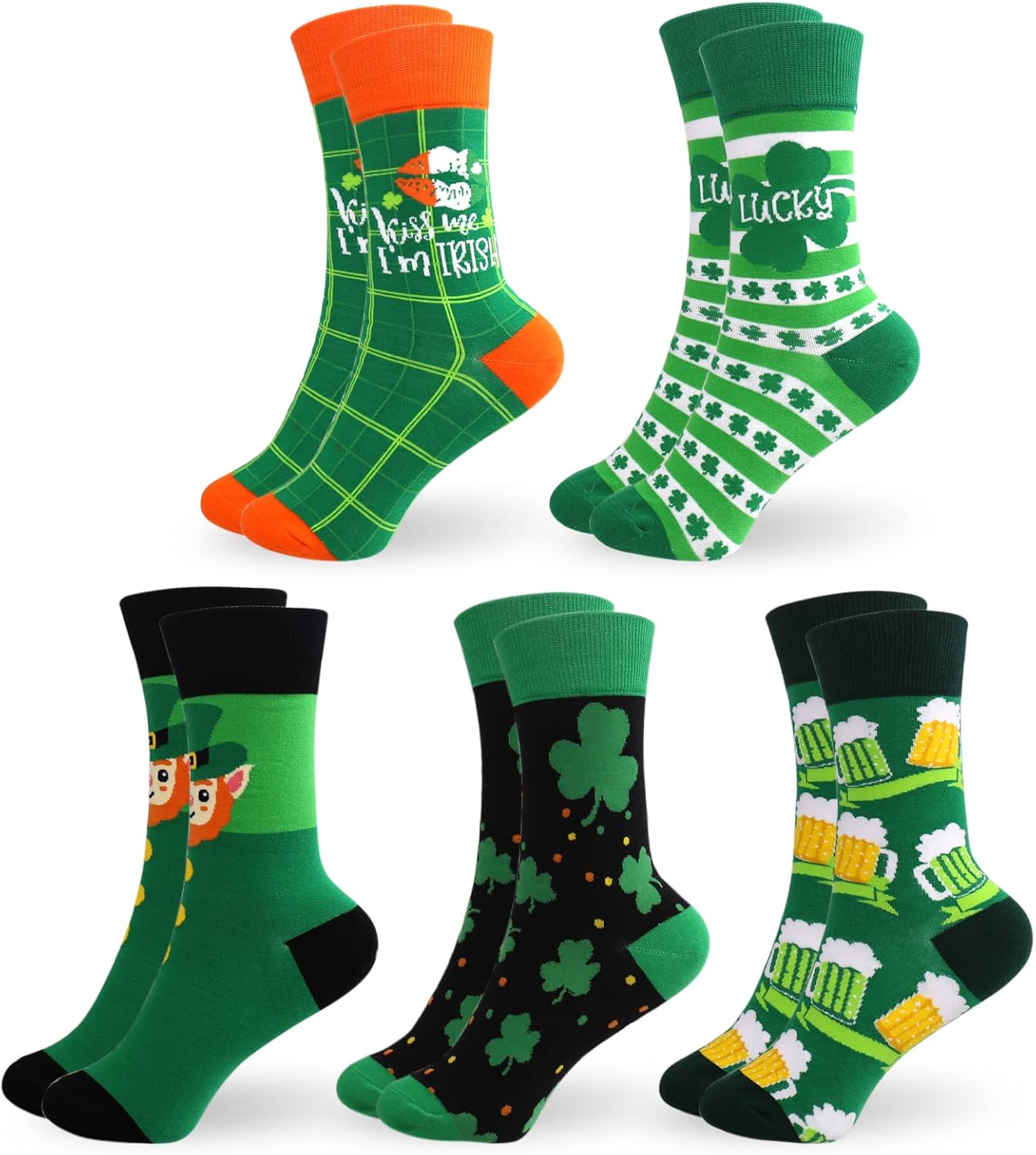 Vansolinne Women's St. Patrick's Day Socks Lucky Shamrock Crew Socks for Women Teens, Soft Cotton Mid-Calf Socks Festive Irish Gifts Party & Daily Wear 5 Pack (Green Clovers Design)
