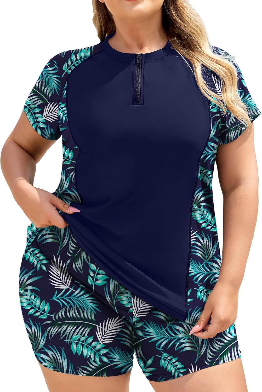 COOTRY Plus Size Two Piece Rash Guard Women Short Sleeve Bathing Suit Zip Up Swimsuit Built in Bra Swim Suit Swimwear Green Leaf 4XL