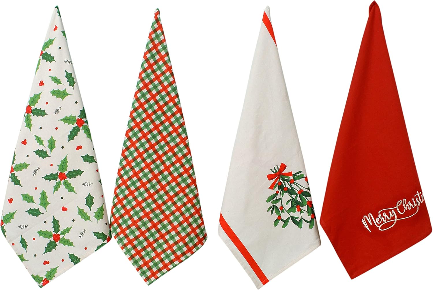 ACCENTHOME Christmas Kitchen Towels - Set of 4 Absorbent Cotton Dish Towels | Merry Christmas Printed Kitchen Linen Tea Towels & Drying Dishes - 20x28 inch