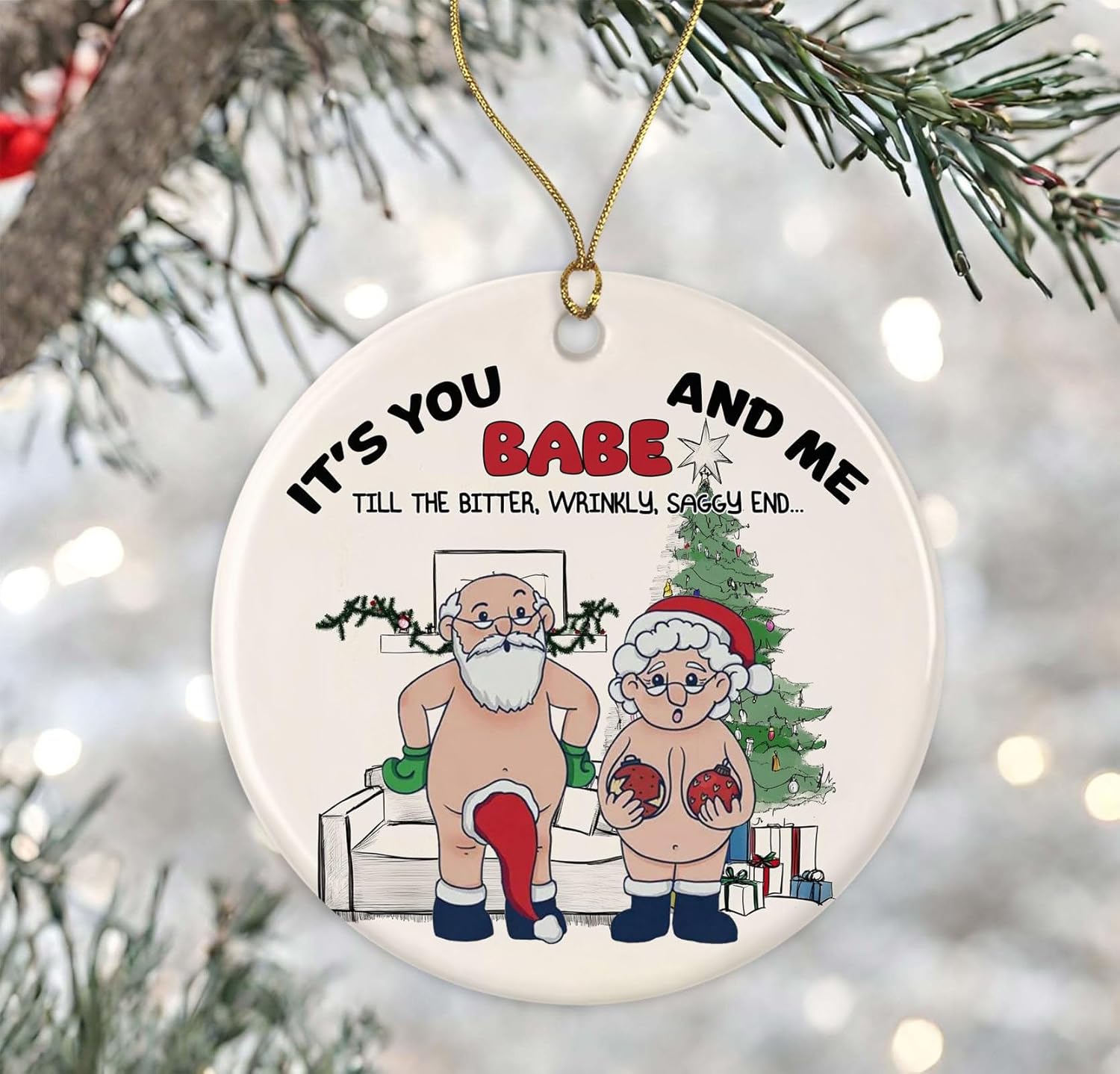 PainterDesign It's You and Me Babe Till The Bitter Wrinkly Saggy End Ornament, Wacky Old Couple Santa, Funny Couple Christmas, Growing Old Together, Ceramic, White, Humorous, Both Sides