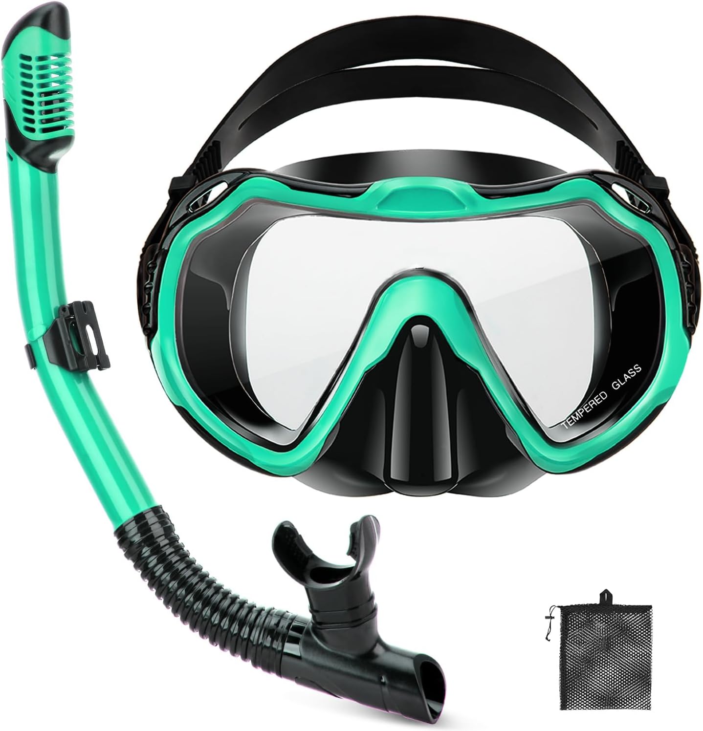 Snorkeling Gear for Adults, Adult Snorkel Set with Panoramic Anti-Leak and Anti-Fog Tempered Glass Snorkel Mask, Dry Top Snorkel, Snorkle Mask Set Adult with Mesh Bag Ear Plug for Snorkeling