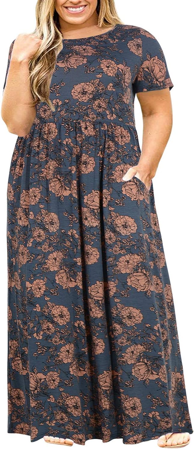 Nemidor Plus Size Maxi Dresses for Curvy Women Summer Casual Loose Short Sleeve Long Beach Dress with Pocket