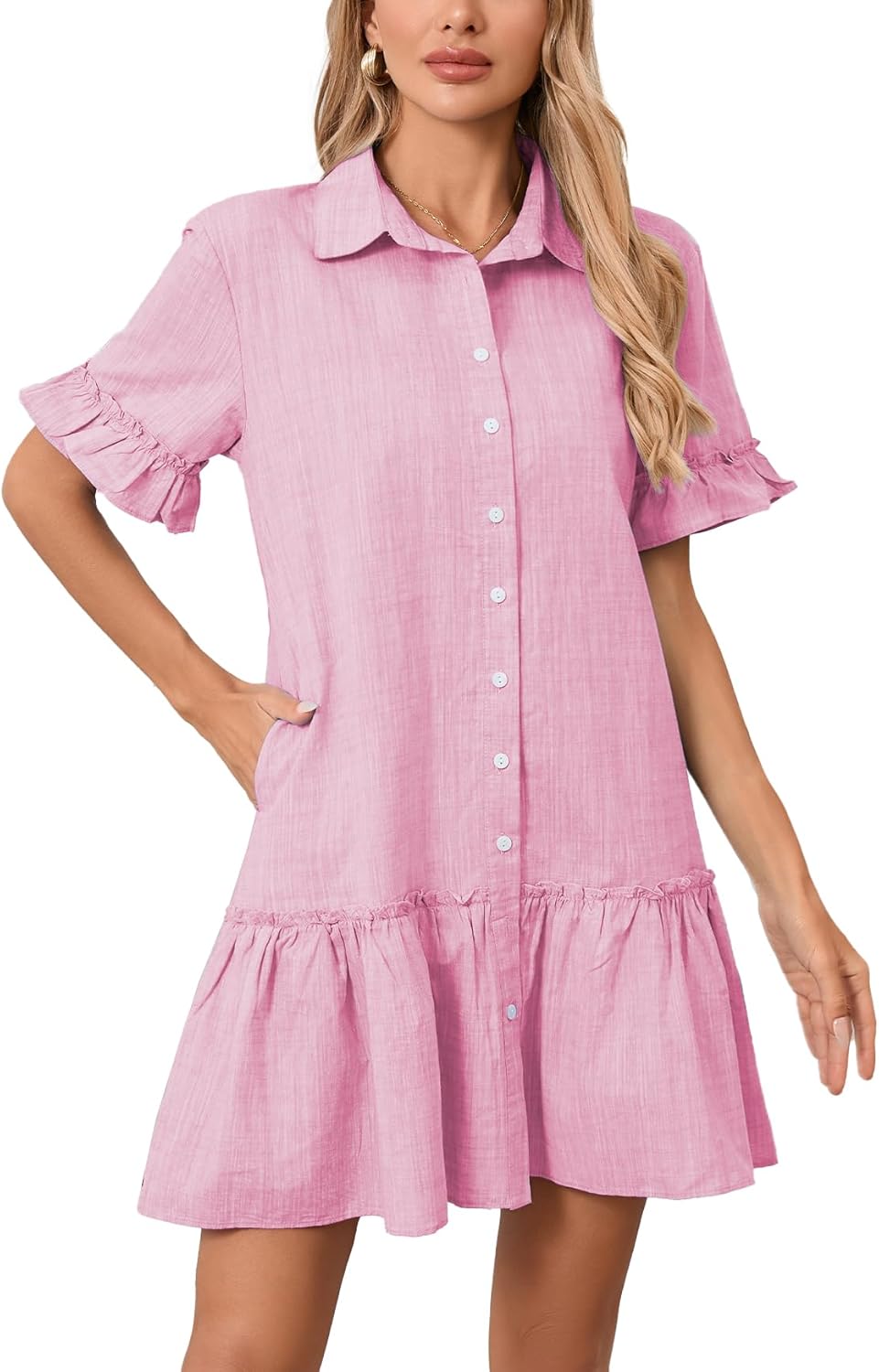 Women's Cotton Linen Ruffle Mini Dress Short Sleeve Button Down Drop Waist Tunic Shirt Dress