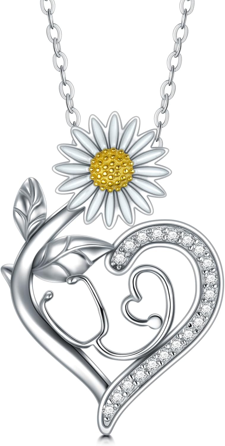 925 Sterling Silver Stethoscope Necklace for Women Flowers and Stethoscope Pendant Necklace Nursing Theme Jewelry Nurses Day Christmas Gift for Nurses Doctors