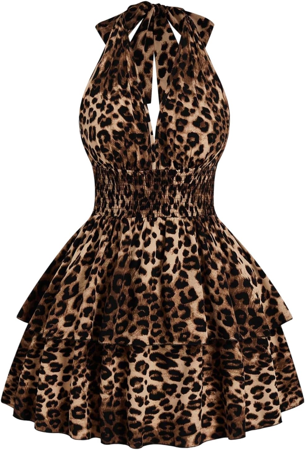 Floerns Women's Plus Size Cheetah Halter Short Dress Sleeveless Shirred Layered Ruffle Hem Y2k Going Out Mini Dresses